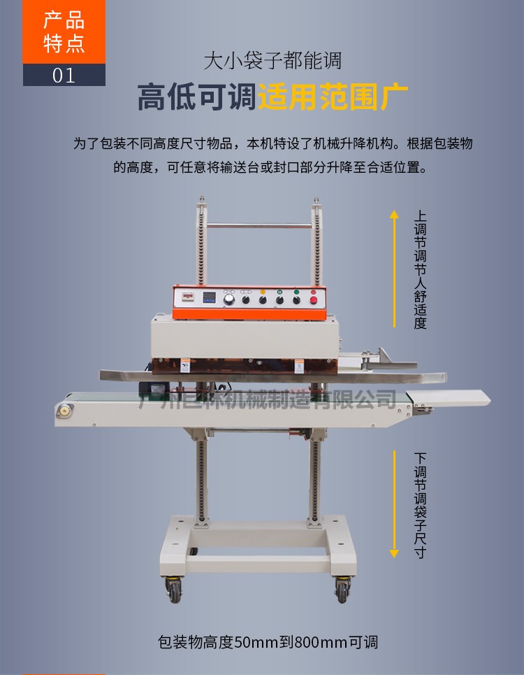 本機適用于任何以熱封材料的封口。速度無級可調(diào),恒溫控制,溫度可調(diào),輸送臺高低可調(diào),適應(yīng)范圍極廣泛。