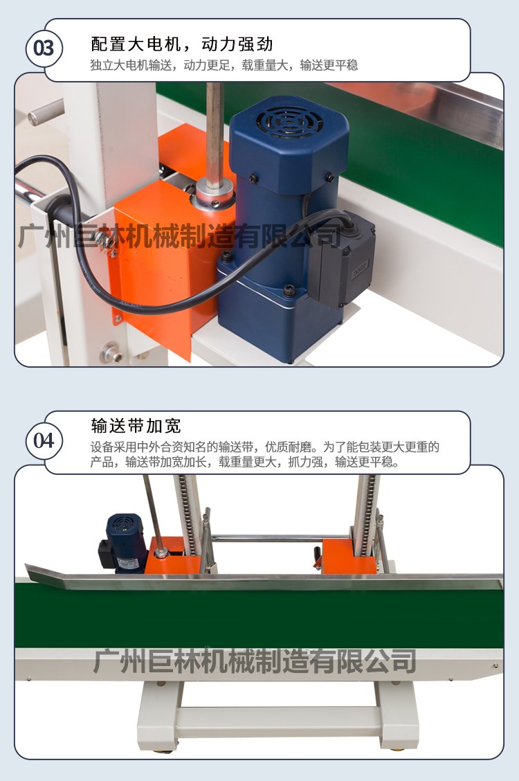 7包裝物進入輸送臺時必須貼著護欄,包裝袋口一旦被引導(dǎo)帶拖入后,輸送帶與封口傳動同步進行封口包裝,此時請不要對包裝物任意推動或阻擋,以免造成封口效果不良。